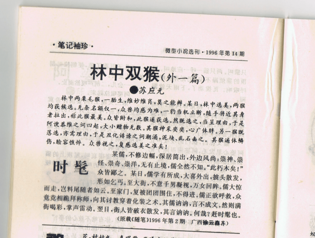 林中两栗毛猴,一胎生,惟妙惟肖, 莫之能解 。某日,林中选美,两猴均获候选。何奈名额仅一,众兽均感为难,一豹当机立断,随手将近其身者拉出,称此猴最美。众皆附和,此猴遂获选。然既选之,当呈理由,于是阿谀恭维之词四起,大小赠物无数。其猴神采奕奕,心广体胖。另一猴既落选,亦需理由,于是丑化诽谤之词潮涌,泥块、乱石击之。其猴遍体鳞伤,脸容憔悴。众兽视之,复感选美之准矣!