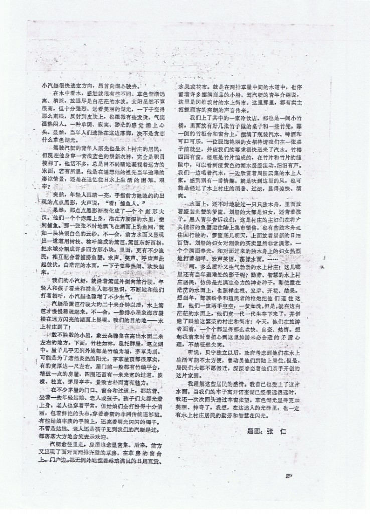 驾驶汽艇的青年人原先也是水上村庄的居民。伹现在他身穿一套浅蓝色的崭新衣裤,完全是职员模样了。他话不多,总是目不转睛地凝视着远方的水面,若有所思。他是在遥想他的祖先当年逃难的凄凉情景,还是在追忆往日水上生活的困难、艰辛?