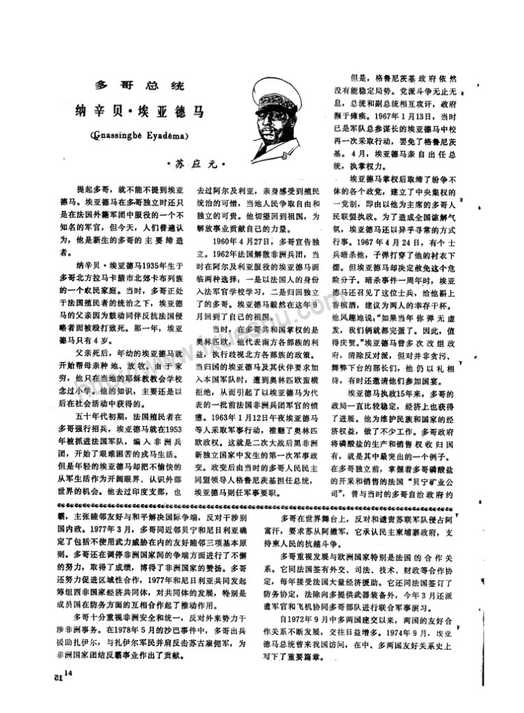 埃亚德马是1967年政变上台的。那时,多哥的经济形势很不好。1956年至1965年,多哥是十二个前法属殖民地、托管区中经济增长率最低的一个国家。1965年,多哥的国内生产总值仅371亿西非法郎①,按人口平均的国内生产总值仅2,100多西非法郎。前政权虽制定了总投资为280亿多西非法郎的1965年至1970年多哥第一个五年发展计划,但由于政权内部争权夺利,计划实际上只停留在纸面上,并未得到认真执行。