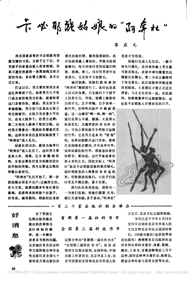 幽居期满,姑娘们就该参加”阿奔杜”舞蹈游行了,此时也是成人仪式的高潮。只见她们个个脖子上挂着贝売、项练,胳膊上缠着洁白的羊毛,左手带镯,右手高举一根竹竿,在咚咚的鼓声中跳跃前进,还一边喊着“啊一啦,啊一啦”。她们是那么丰满、健康,又是那么欣喜若狂,充满青春的欢乐和活力。可别小看姑娘手中那根不起眼的竹竿,它是男方送来的“情物”呢。如果姑娘默许这门亲事,便将订亲细绳系在腰间,手中高举竹竿;如果姑娘拒收竹竿,那就意味着拒绝婚事。要知道,这竹竿象征着姑娘未来的丈夫。因此实际上“阿奔杜”就是卡必耶族姑娘的集团婚礼。届时部族里的人都要前来欢送祝贺,唱歌鼓励姑娘们,小伙子们此时更是手舞足蹈,喜不自禁。