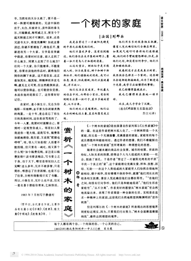 《语文世界》1998年第2期 (含赏析)选自《外国散文名篇选读》