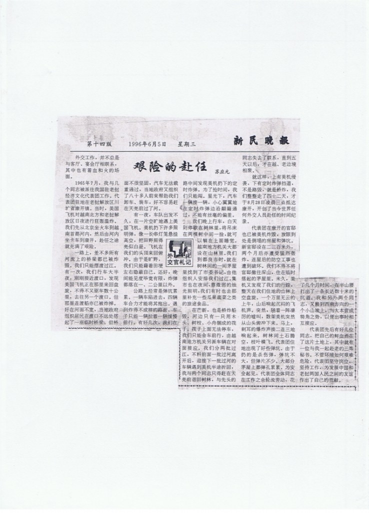 1966年12月初,我和一位同事回国休假,就在我两在河内等待回国期间,美机对河内又进行了大规模轰炸,我国驻越南大使馆也遭受袭击,当时,我倆住在使馆商务处,轰炸后赶往使馆馆舍,看到使馆的主楼被整整掀去了一个角。使馆的法文翻泽是我在外交部翻译室工作时的一个同事,他带我前往他的办公室。他的办公桌也被弹片打穿了一个洞。